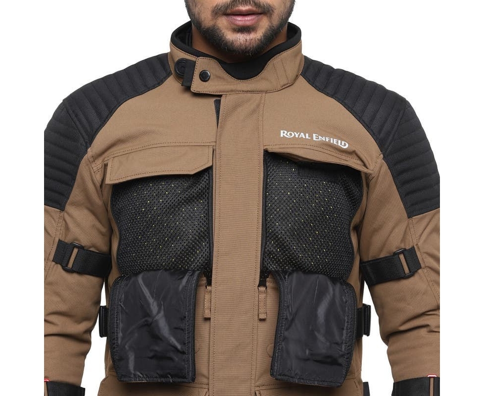The Royal Enfield NIRVIK jacket creates a new standard in touring jackets. Crafted from high-density NYLON & Cordura fabrics, quipped with D3O – T5 EVO PRO/CE Level 2 protectors around the shoulders and elbows, this jacket provides superior protection against impact and abrasion yet remains light. CE certified Level 1 protection at the back and Level 2 at the chest adds another layer of safety, whether on asphalt or gravel. In addition, an array of features like a detachable thermal layer, a rain-jacket that can be worn either as an inner or outer liner, large ventilation areas in high airflow mesh, and five spacious pockets for storing essentials, makes this jacket the best bet for creating legends, be it cruising the highways or blazing new trails.