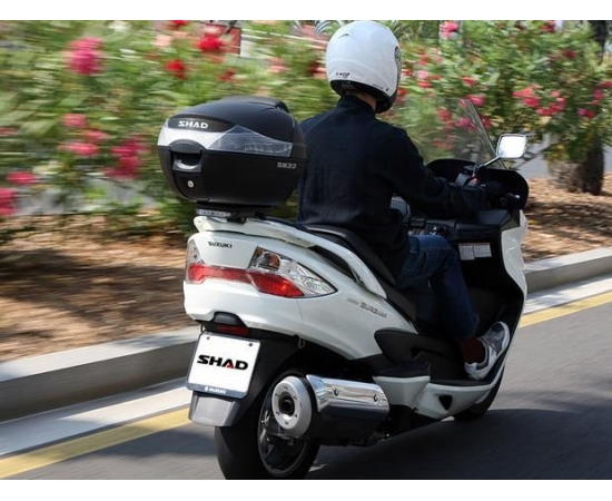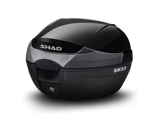 SHAD SH33 top case features an innovative design, offering a compact and practical storage solution. This Top Case is an optimal trunk for mopeds, scooters, off road motorcycles and street bikes, weighing in a little under 7 pounds. The SH-33 features the Press Lock system for quick release and an integrated carrying handle for easy portability. Mounting plate included for quick install on any flat rear surface. Backrest and LED Light kit and colors are optional.