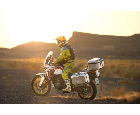 The TR36 side case is designed, engineered and made 100% in Barcelona. Made from hardened aluminum alloy, a stronger and lighter type of aluminum which allows a reduced cross-section of 1.2 mm to obtain a minimum weight with maximum resistance. AISI 304 stainless steel hinges and pegs, so you can set the case on the ground without it rolling over, and ABS case guards to protect from impacts.