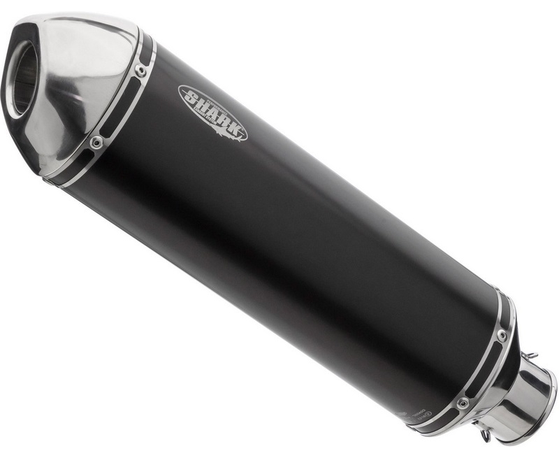 Materialmix und fünfeckige Endkappe geben dem SHARK DSX-5 seinen ganz speziellen Look. Der schwarz eloxierte Aluminiumendtopf mit polierter Edelstahlendkappe ist im Design einzigartig, aber soundtechnisch typisch SHARK: kernig, kräftig, aggressiv. Befestigt wird der elliptische Ersatzdämpfer mit einem schraubbaren Halter. Mit EG-BE.