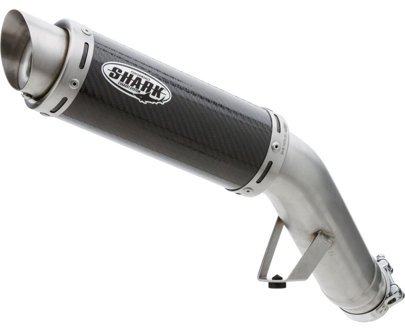 Mit dem SHARK Factory wird die Straße zur Rennstrecke: Extrem schlanker und kurzer Alu-Endtopf (Ø 100 mm), aggressiv angeschrägte Endkappe und tief kerniger Sound. Das extra dicke Sportzwischenrohr schließt sauber an. Befestigt wird der Ersatzdämpfer mit einem schraubbaren Halter. Mit EG-BE.