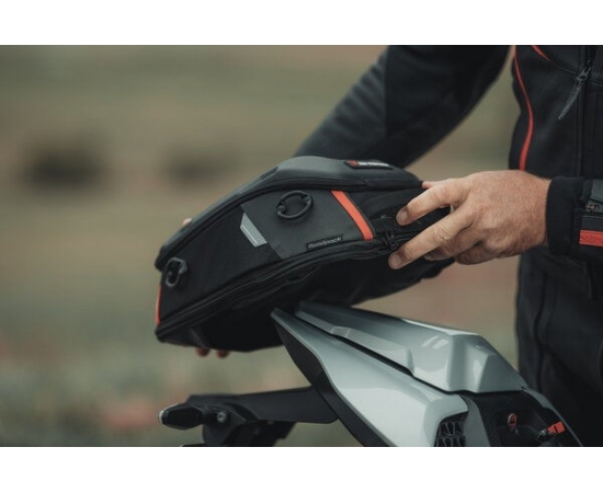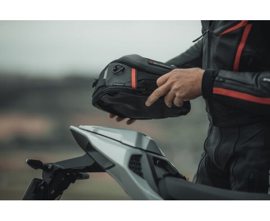 The PRO Roadpack is a compact bag that fits perfectly on the tail of small and sporty motocycles. The volume of the small tail bag can be increased from 8 to 14 liters with a zipper. An inside pocket with zipper in the lid provides storage for keys, wallet and other small items. In addition to the enclosed loop straps, two Velcro straps and a slot on the underside enable quick and secure attachment to the seat or rack. The stiffened sides, molded EVA lid and straps for tightening the volume expansion guarantee the bag will keep its shape even when used by those who like a sportier ride.