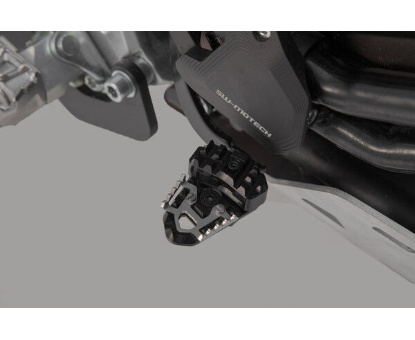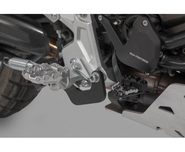 SW-MOTECH manufactures these extensions from high-strength milled aluminum alloy; they feature a black anodized surface and a stainless steel step plate. For optimal ergonomic adjustment, the increase in the brake pedal step can be adjusted in two stages of 22 or 27 millimeters.