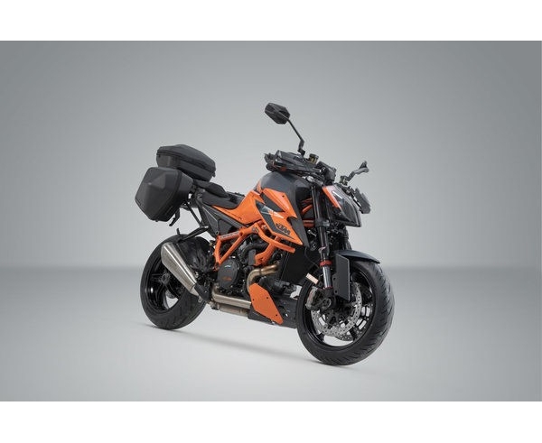 The perfect combination of top case and rack for the KTM 1290 Super Duke R: the aerodynamic URBAN ABS top case and the sleek STREET-RACK offer a luggage solution that's both sporty and made for everyday life.The sleek STREET-RACK, included in the set, was specifically developed for sporty motorcycles, naked bikes and smaller street bikes. SW-MOTECH finishes the STREET-RACK with powder coated aluminum and offers the right models for numerous bikes. You simply mount the rack on your bike's original attachment points.