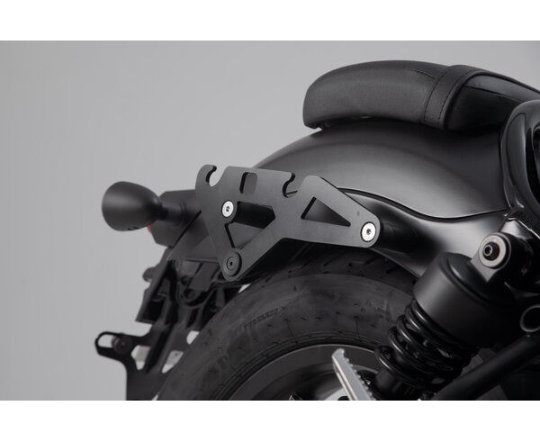 The bike-specific bag carrier can be easily and quickly mounted on to original attachment points on the fender strut. The quick lock system allows LH Legend Gear side bags to be attached and removed in just a few easy hand movements, without the driver foregoing reliable bag fastening.
