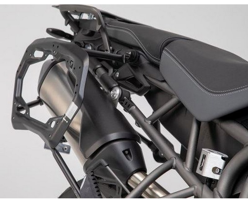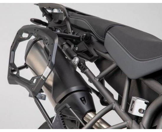 The side carriers are extremely durable and designed to fit closely along the vehicle. SW-MOTECH manufactures these side carriers in robust steel and then finish them off with a black powder coating. The patented QUICK-LOCK system allows the carrier to be attached and removed quickly - after a quarter turn at the attachment points, the carrier can be removed completely and only inconspicuous mounting tabs remain on the motorcycle.