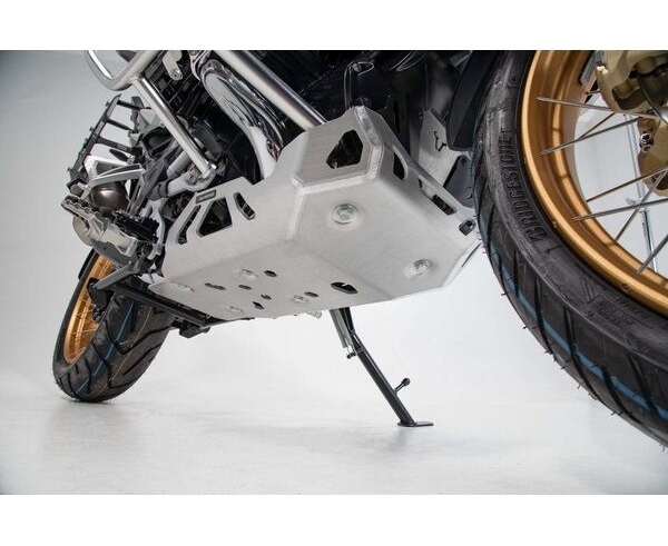 The particularly robust engine guard made of 5-mm thick brushed aluminium offers the best protection for valuable components of the BMW R 1250 GS and R 1250 GS Adventure, both on and off-road. Three mounting elements allow the force to be evenly distributed among the strong attachment points. This also makes attachment considerably easier.