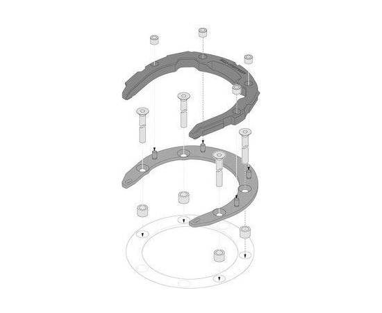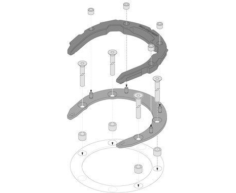 This way, the top ring can be custom-aligned onto the guide rail on the underside of the tank bag. Once the right position has been found, the top ring is screwed tight. When changing to another motorcycle, the position of the upper ring can be adjusted accordingly.