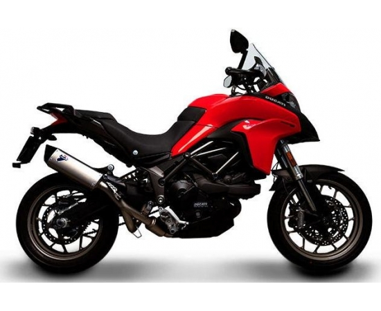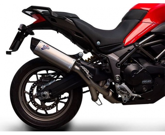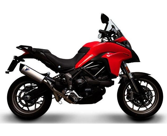 COMPLETE SYSTEM Termignoni introduces the complete racing system for Ducati Multistrada 950 (Model Year 2016-2018), code D168.The complete racing system developed by Research and Development to give performance and weights to race with a unique look.Full system is characterized by a structure in Stainless Steel, and the silencer has a titanium sleeve.The cap worked at CNC and anodized black present an exclusive “Force” design to give a more racing look at your Multistrada.It offers a reduce of weight (– 3,700 kilos)In terms of performance it offers an increase of power ( + 5,27 Hp at 7.000 rpm) and torque (+ 4,9 Nm at 7.000 rpm). Stainless steel - Titanium