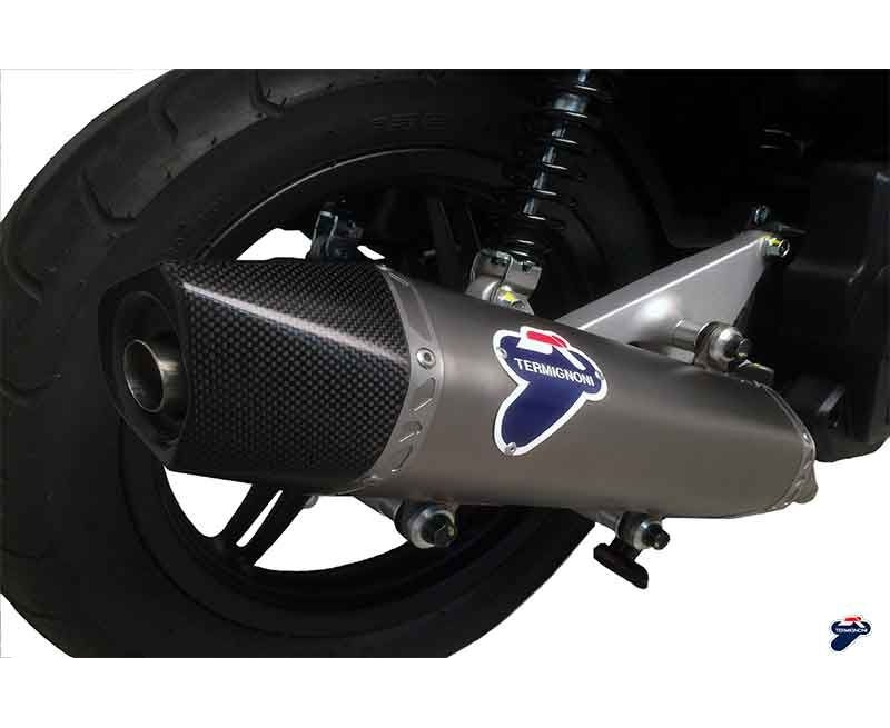 IMPIANTO DI SCARICO COMPLETO Termignoni offers the complete exhaust system available in racing version, H124 code, dedicated to HONDA PCX 125/250 (anno 2014-2016).The silencers are developed in stainless steel versions, with rear cap in carbon.It offers a reduce of weight (- 2500 kg)Struttura Inox - Fondello Carbonio - Camicia Stainless Steel