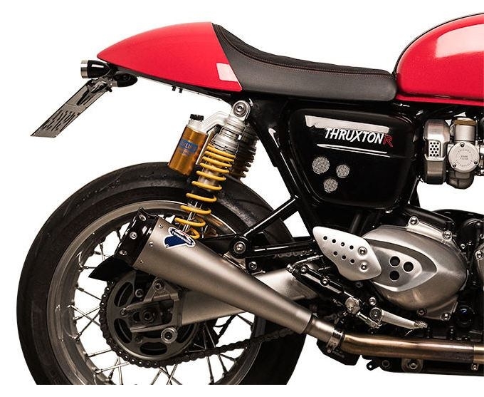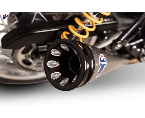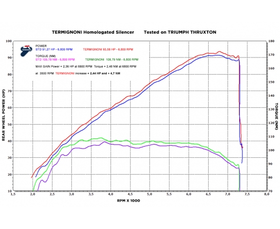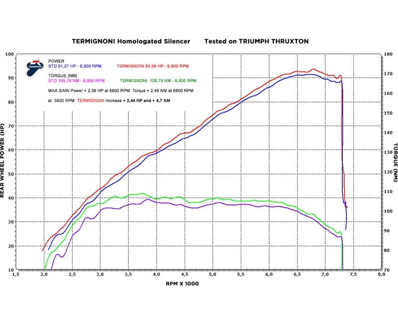 SILENZIATORI Termignoni introduces the new homologated silencers for Triumph Thruxton (Model Year 2016-2018)The exhaust system is characterized by double silencers in steel brushed, with rear black cap.Double silencers are characterized by the main structure and sleeve in stainless steel and CNC black anodized rear cap.In terms of performance they offers; an increase of power ( + 2,36 Hp at 6.800 rpm) and torque (+ 2,48 Nm at 6.800 rpm).Max gain at 3,500 rpm + 2,44 HP and + 4,7 Nm Inox