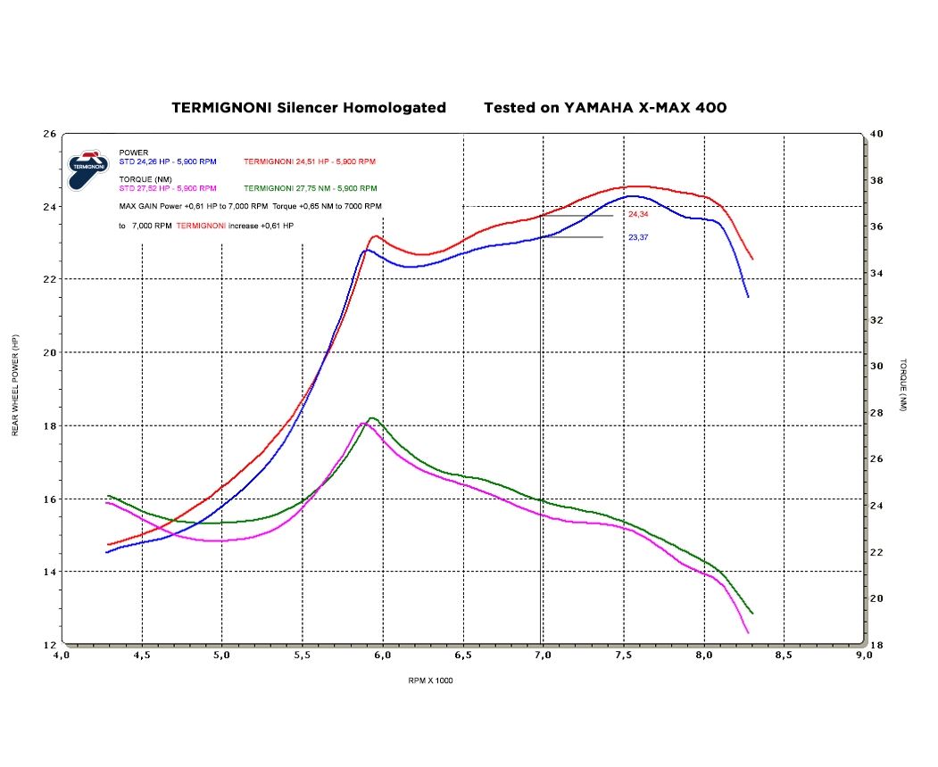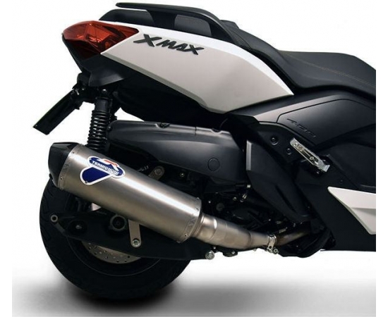 SILENCER Termignoni offers the homologated silencer, Y110 code (only if use in conjunction with catalyzer Y110CAT code), characterized by the iconic design “relevance” dedicated to YAMAHA XMAX 400 (year 2010-2016).Silencer is characterized by a stainless steel structure, with rear cap in carbon.The exhaust gives a saving – 6,550 kg in weight.Inox e fondello in carbonio