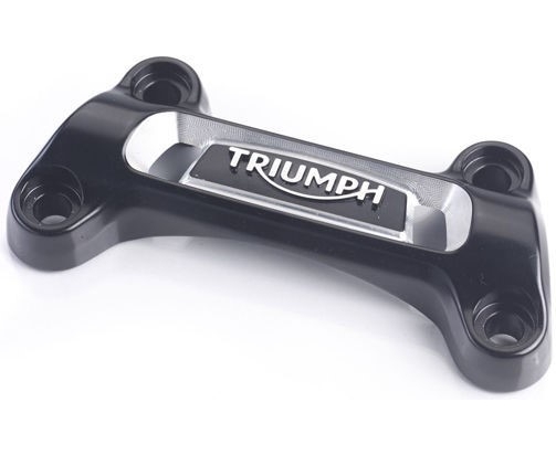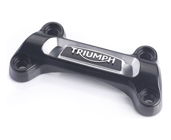 Triumph Machined Handlebar Clamp - 28.5, A CNC machined Upper Handlebar Clamp that can be attached in place of the original equipment part. It features the iconic Triumph logo and a black anodised finish.