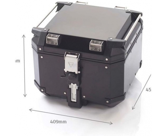 Triumph Expedition Aluminium Top Box (black), The robust and durable water-resistant Expedition Aluminium Top Box is made from a 1.5mm thick single skin aluminium structure, with polymer corner reinforcements for enhanced protection and dynamic mounting assembly to ensure performance levels are not compromised even when fully loaded. Each Expedition Top Box has a capacity of 42 litres. Includes added security of a one key locking mechanism to match your bikes ignition key.Additional information:- Offers a significant weight saving compared with Triumph Adventure Top Box- High quality Triumph branded base and latch with a quick release attachment for ease of use- Sleek black finish- Matching Expedition Panniers also available- Mounting rail sold separately.