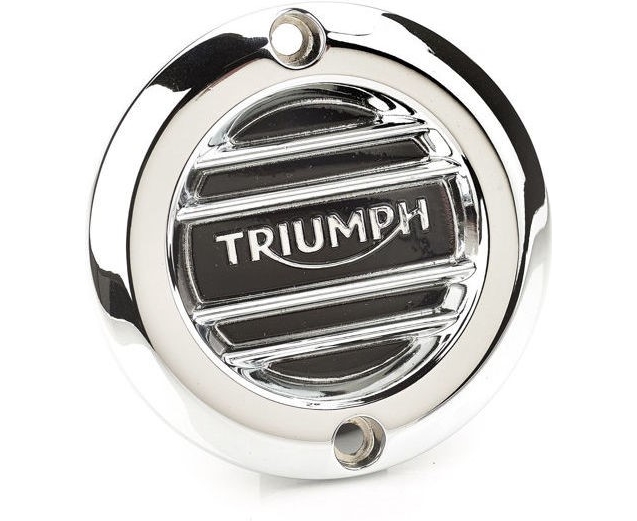 Triumph Chrome Clutch Badge - Ribbed, A cast aluminium Clutch Badge that subtly enhances your motorcycles style. It can be attached to your Triumph in place of the original part. Features Triumph branding on a glossy black backing and a chromed finish with ribbed detailing. Other finishes and styles are available.