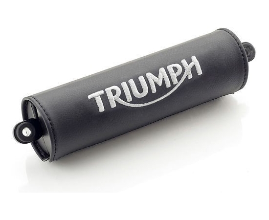 Triumph Black Handlebar Brace, A stylish handlebar pad with embroidered branding.Made from forged and machined aluminium with a high density foam body and vinyl wrap.*Triumph Embroidered Branding*Offered in Black and Brown variants to match*Scrambler XE and Scrambler XC Standard and*Accessory Seat Vinyl