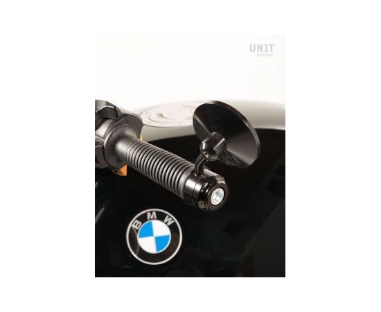 CNC-milled Mirrors in black anodized aluminum constructed ad- hoc for the nineT. This mirror can be mounted on both the right and left side of the handlebar. Mirrors are always a problem for the look of the bike, therefor we chose a very minimalistic styling. It comes complete with two aluminum bar ends and mounting screws ( can not be mounted with the original plastic bar ends )