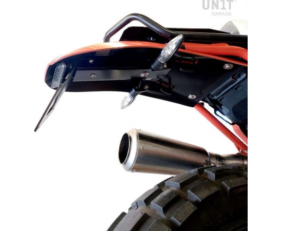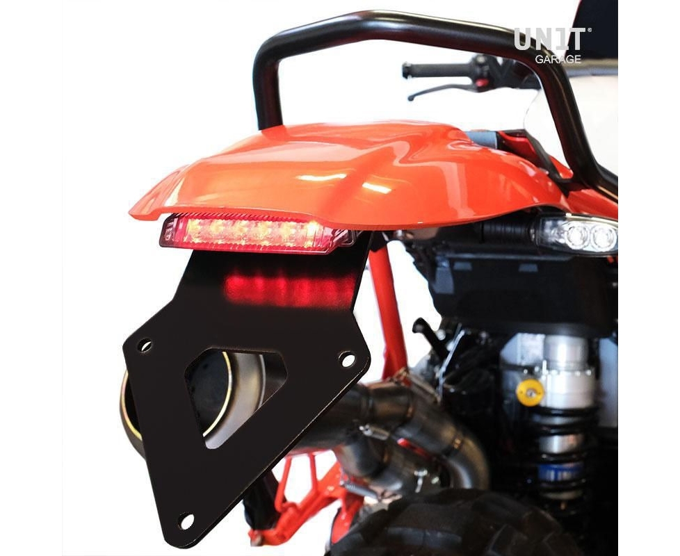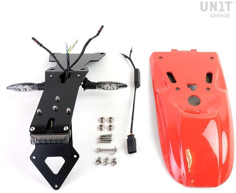 ABS rear fender, complete with everything needed for assembly. It fits perfectly with the design of the bike. It can also be mounted with the original saddle, with or without passenger frame. Specially developed aluminum license plate holder included, with integrated LED light. (see photo). Completely modular, the license plate support or the indicator supports are included but can be disassembled if you want to position the arrows or the plate in another way, for example with the low license plate holder Cod. 1610. The electrical wiring is plug and play, all electrical connections are made with connectors that do not require soldering or modifications of the original wiring. Stainless steel screw kit included. Available in various colors and unpainted.