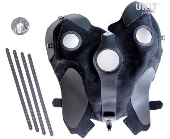 This tank cover was handmade in Italy in robust top quality split leather; treated with wax to make it water-resistant. Detailed with 3mm leather trim, it oozes vintage-style and with an extra padded inside layer it will protect the tank against knocks and scratches when traveling. The mounting kit includes a spacer in anodized aluminum to raise the fuel cap, so in addition to securing the cover in the right position with the included straps, you will also have a fixed point to attach our luggage rack.