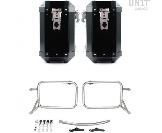 Unit Garage Pair of aluminium Panniers Atlas 40L+40L with Subframes R & GS, Black Panniers + Silver Frames | 2xAL1_BL+1528-Black-Panniers+Silver-Frames