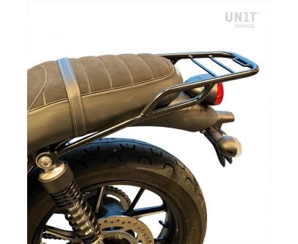 Luggage rack made of steel tubing with matt black epoxy powder coating. Completes the rear part and is provided with handles for the passenger, it is very simply fixed to the frame underneath the passenger seat. Lightweight, practical and equipped with guides for fixing straps. Improves the aesthetics of the bike.