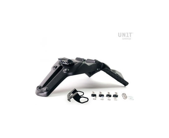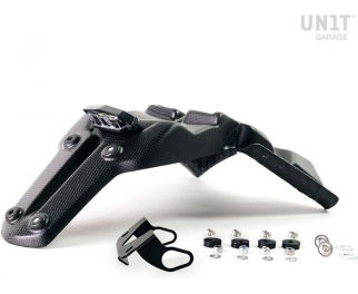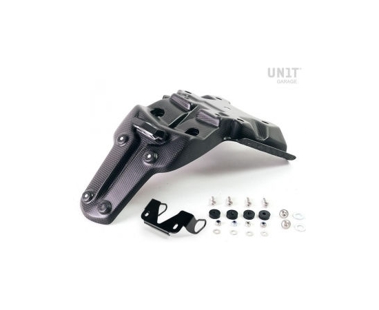 The long rear plastic bothered us, the result is fantastic! Made of carbon with a matte black finish, it weighs only 150 grams. Complete with led light for license plate lighting, it is ready to house the original headlight. It is fixed to the frame very simply, just like the original one, it allows you to significantly change the character and style of the bike in the rear by shortening and raising the number plate. Complete with supports for the original or aftermarket indicators (arrows not included.) And everything necessary for assembly, it is compatible with our rear pannier or pannier racks.