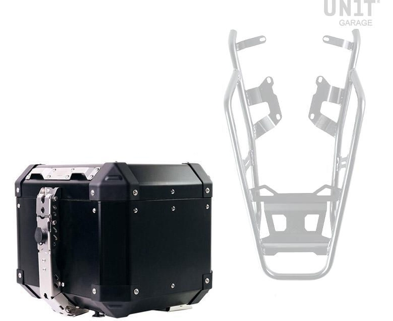 It completes the rear and is equipped with comfortable grab handles for the passenger. Sturdy and practical, it can house rigid plastic or aluminum cases. Available with silver finish or treated with high resistance matt black powder coat.
