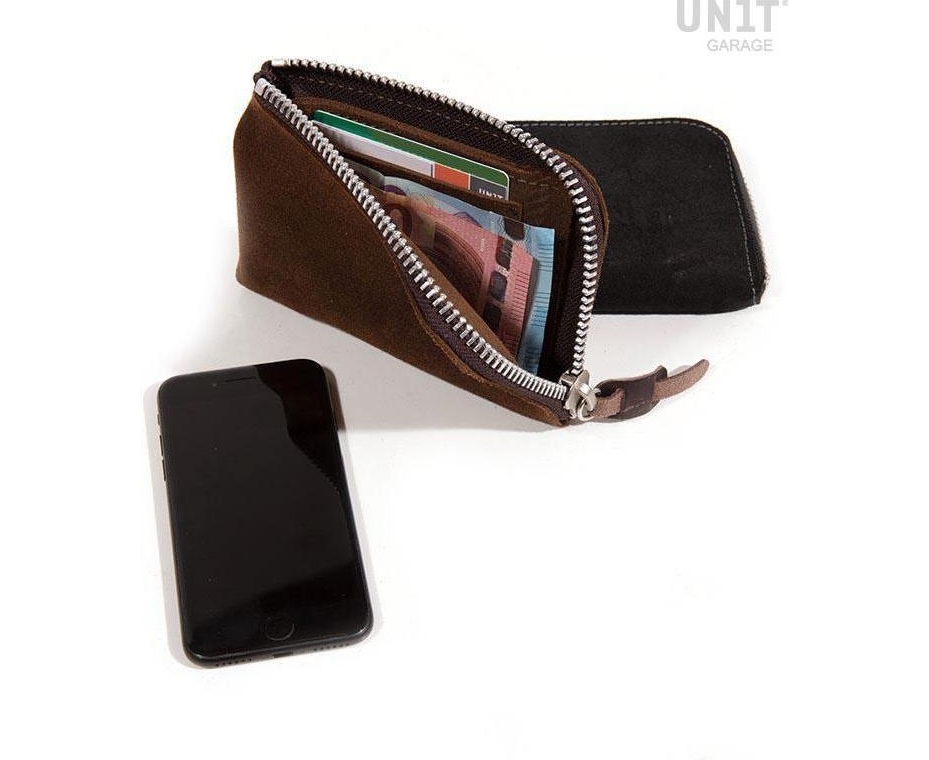 Made of split leather, it can be used with the phone inserted on the side as a wallet or passport holder.