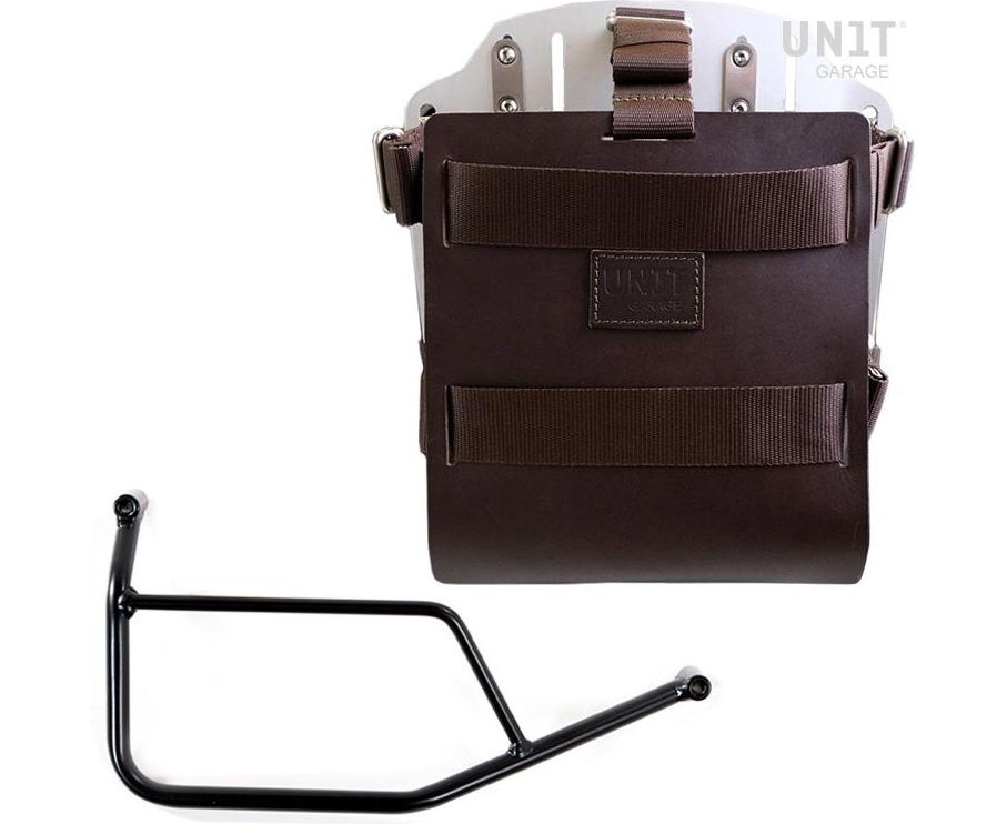 Carrying system in aluminum complete with adjustable leather front. It quickly attaches to our bag holder frames with the quick release system cod.U000 already included and mounted on the back of the plate , which is equipped with a lock for locking on the frame itself. The plate creates a flat mounting surface on the side of the bike, this will allow the transport of unattached bags or other objects, such as sleeping bags, jackets etc. The front flap, with attention to the smallest details with 3 mm leather finishes, can be adjusted using the supplied sliders and can be removed very quickly from the plate.