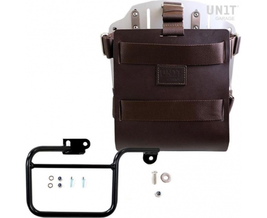 Carrying system in aluminum complete with adjustable leather front. It quickly attaches to our bag holder frames with the quick release system cod.U000 already included and mounted on the back of the plate , which is equipped with a lock for locking on the frame itself. The plate creates a flat mounting surface on the side of the bike, this will allow the transport of unattached bags or other objects, such as sleeping bags, jackets etc. The front flap, with attention to the smallest details with 3 mm leather finishes, can be adjusted using the supplied sliders and can be removed very quickly from the plate.