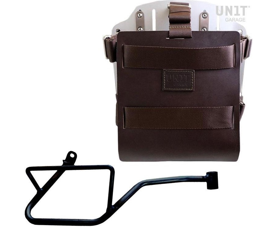 Carrying system in aluminum complete with adjustable leather front. It quickly attaches to our bag holder frames with the quick release system cod.U000 already included and mounted on the back of the plate , which is equipped with a lock for locking on the frame itself. The plate creates a flat mounting surface on the side of the bike, this will allow the transport of unattached bags or other objects, such as sleeping bags, jackets etc. The front flap, with attention to the smallest details with 3 mm leather finishes, can be adjusted using the supplied sliders and can be removed very quickly from the plate.
