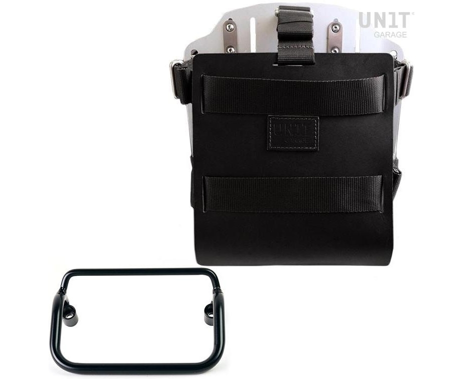 Carrying system in aluminum complete with adjustable leather front. It quickly attaches to our bag holder frames with the quick release system cod.U000 already included and mounted on the back of the plate , which is equipped with a lock for locking on the frame itself. The plate creates a flat mounting surface on the side of the bike, this will allow the transport of unattached bags or other objects, such as sleeping bags, jackets etc. The front flap, with attention to the smallest details with 3 mm leather finishes, can be adjusted using the supplied sliders and can be removed very quickly from the plate.