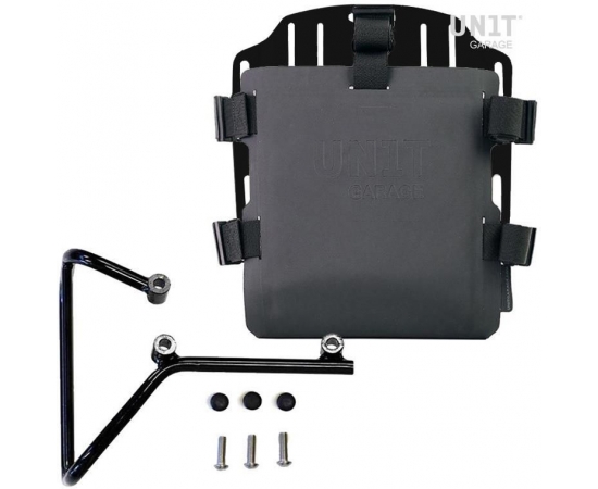 Carrying system in aluminum complete with adjustable Hypalon front. It quickly attaches to our pannier sub frames with the quick release system cod.U000 already included and mounted on the back of the plate. With the included key the quick release system can be closed, locking the carrying system to the frame. The plate creates a flat mounting surface on the side of the bike, this will allow the transport of various types of bags and other objects, such as sleeping bags, jackets etc. The front flap in Hypalon can be adjusted using the supplied sliders and can be removed very quickly from the plate.