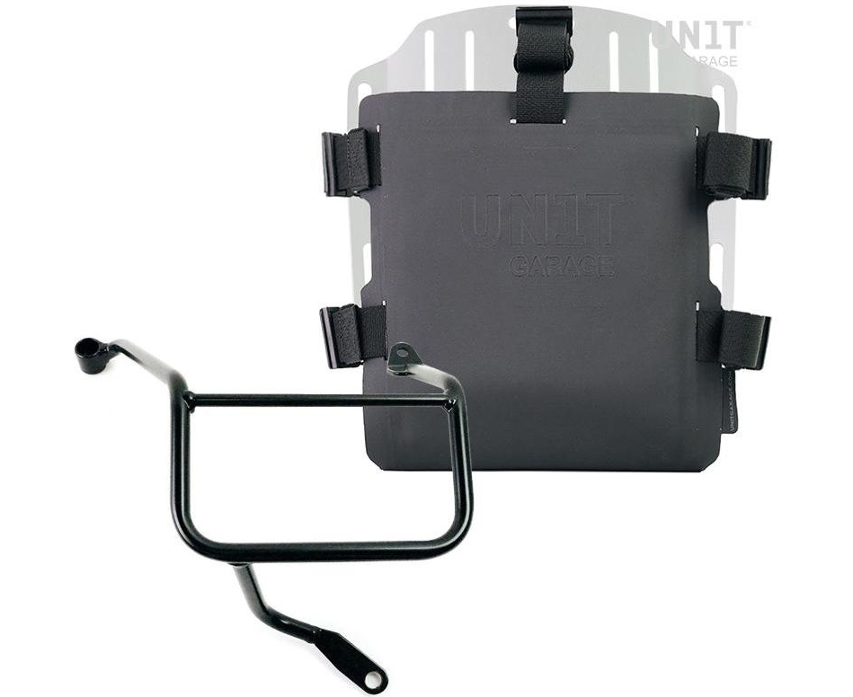 Carrying system in aluminum complete with adjustable Hypalon front. It quickly attaches to our pannier sub frames with the quick release system cod.U000 already included and mounted on the back of the plate. With the included key the quick release system can be closed, locking the carrying system to the frame. The plate creates a flat mounting surface on the side of the bike, this will allow the transport of various types of bags and other objects, such as sleeping bags, jackets etc. The front flap in Hypalon can be adjusted using the supplied sliders and can be removed very quickly from the plate.