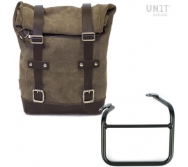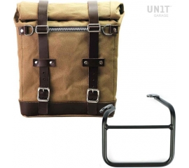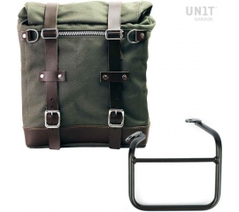 Article Number : U001-3304SX Side pannier with Left subframe Side pannier made by hand in Italy in top quality waterproof waxed canvas. Simple and pure with beautiful details in 3mm thick leather trim. It attaches easily to our sub frame with the quick release system Cod.U000 already installed...
