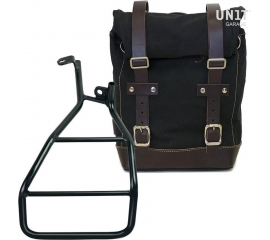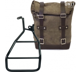 Article Number : U001-3320DX Side pannier with subframe Side pannier made by hand in Italy in top quality waterproof waxed canvas. Simple and pure with beautiful details in 3mm thick leather trim. It attaches easily to our sub frame with the quick release system Cod.U000 already installed on the...
