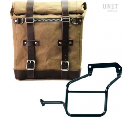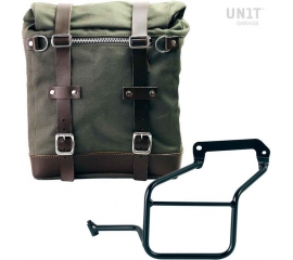 Article Number : U001-3600SX Side pannier with Left subframe Side pannier made by hand in Italy in top quality waterproof waxed canvas. Simple and pure with beautiful details in 3mm thick leather trim. It attaches easily to our sub frame with the quick release system Cod.U000 already installed...