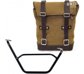 Article Number : U001-1229 Side pannier with subframe Side pannier made by hand in Italy in top quality waterproof waxed canvas. Simple and pure with beautiful details in 3mm thick leather trim. It attaches easily to our sub frame with the quick release system Cod.U000 already installed on the...