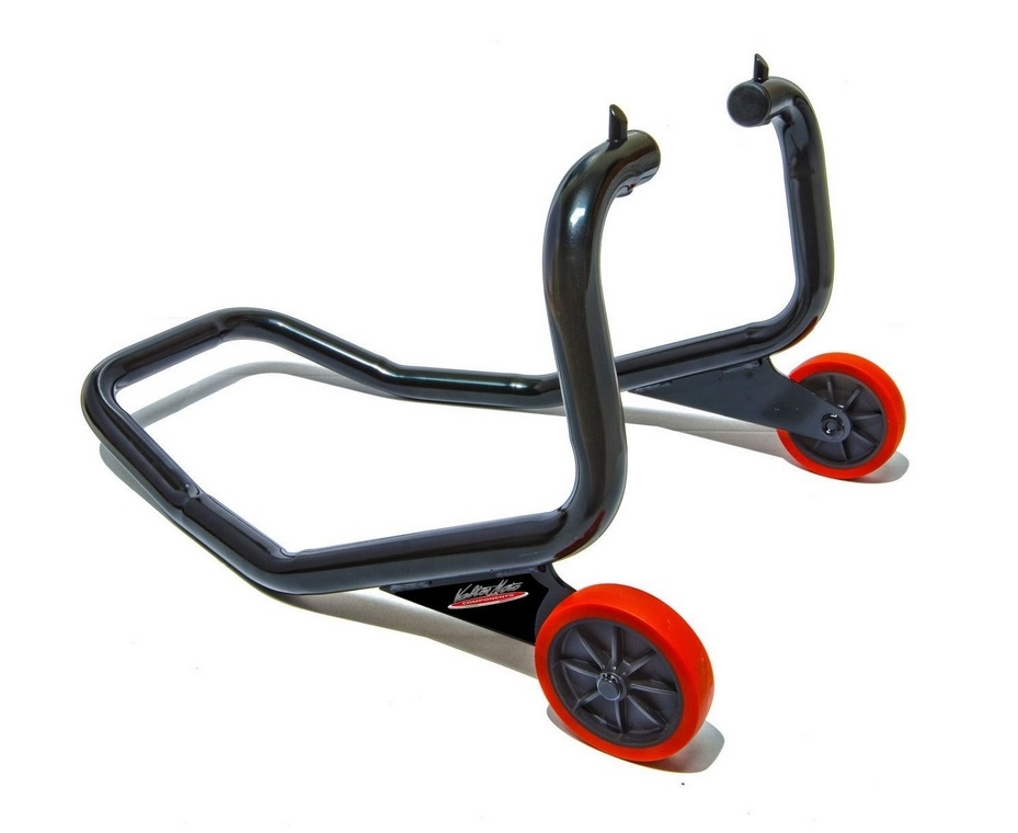 This model of front stand is the best seller of VMC front stands line. Is made with strong steel and painted with a special matt powder coating. Is equipped with two red/black large wheels. It must be used to lift front wheel by under forks holes. The width can be manually adjusted to fit with all racing bikes. Available only in black color.