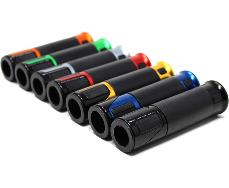 Top grips are perfect to improve bike look and to offer a safer hold. These grips are made with "no-slippery" rubber enriched by three alu insert CNC machined available in different colors. External diameter is 32 mm and fit on all Ø 22 handlebar. Three throttle gear are included for most popular bikes use. Unusable on Aprilia, MV, KTM, BMW and electronic throttle system.