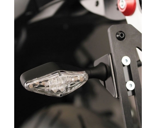 Universal 12V Led indicators arrow shaped short stem . Aluminum black body with amber hi-brightness Led, clear lens. Two resistors included E-marked - 2 pcs package