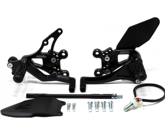 Rearsets are provided with black aluminum heel protections, the correct lenght shift rod, shift and brake ball joints, brake light pressure switch.